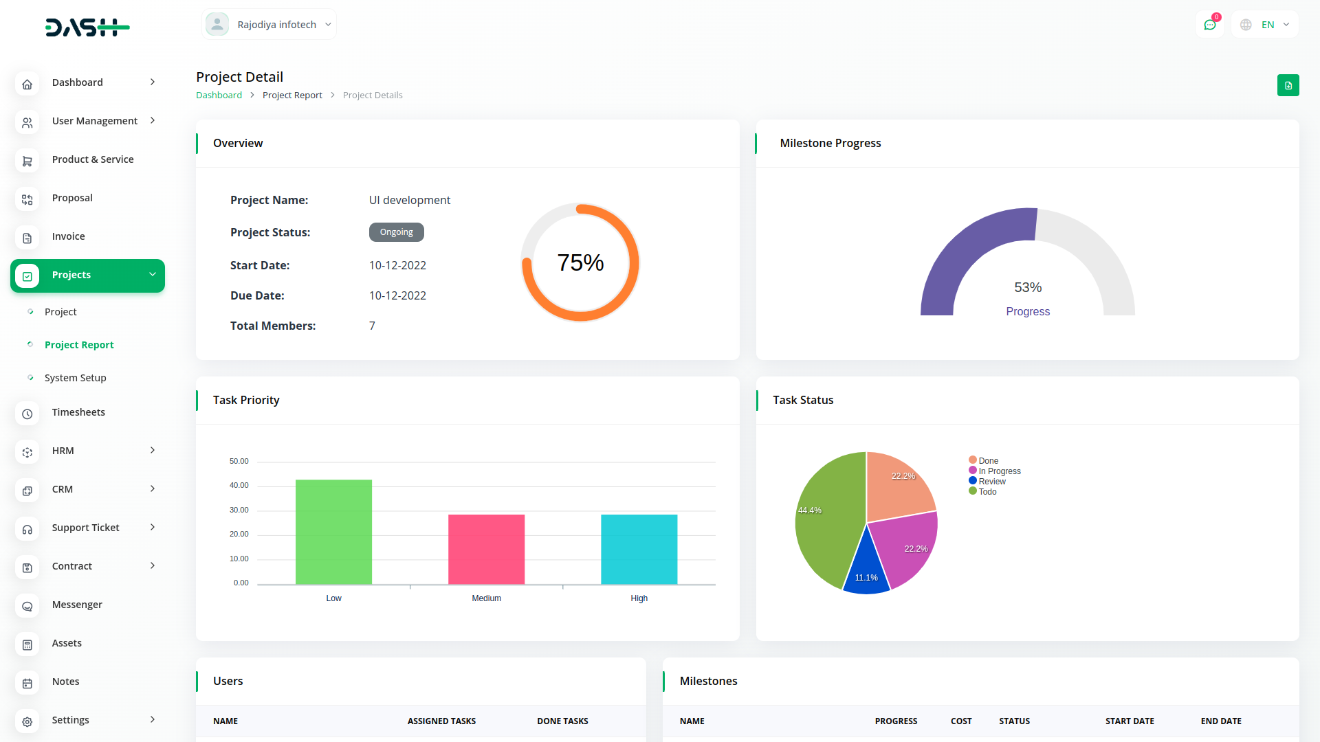 Get an overview of the total number of projects, tasks, bugs, and members. A visual representation of the task overview and project status can help you estimate the progress on each task. Lastly, you can check the top due task.